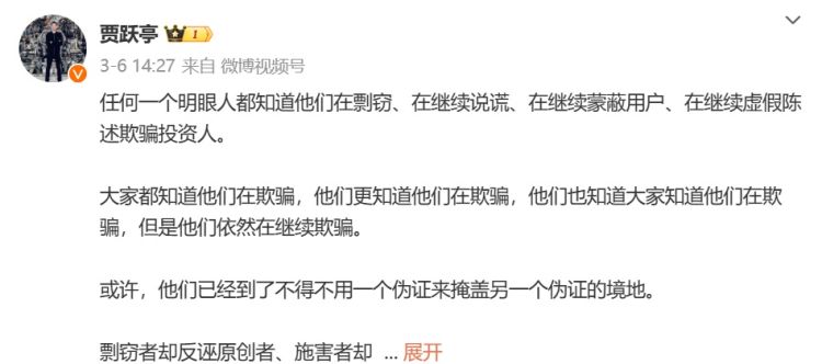 3月6日,贾跃亭在微博再度发文称:“任何一个明眼人都知道他们在剽窃、在继续说谎、在继续蒙蔽用户、在继续虚假陈述欺骗投资人。”